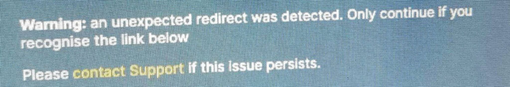 Efter samtal med min support kunde problemet lösas efter tre, fyra dagar. Deras svar var ”Du är avlyssnad”. I och för sig ingen överraskning, men det känns inte roligt. Därför är vi försiktiga med hur vi använder våra kommunikationer och kontakter. Allt är inte guld som glimmar, och allt är inte säkert bara för att man kan höra eller se den man vill nå. Mejlkontakt är mer eller mindre bannlyst. Så vid ett annat tillfälle syntes en varning: ”An expected redirect was detected.”