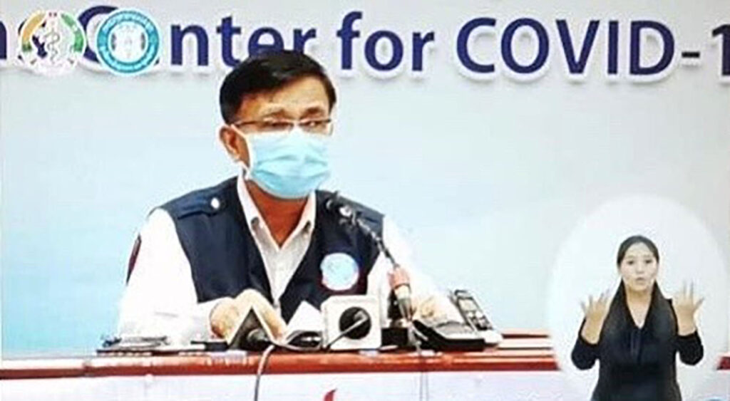 Dövskolans grundare och direktor Sophaphone tolkar till teckenspråk på nationell Lao–TV.